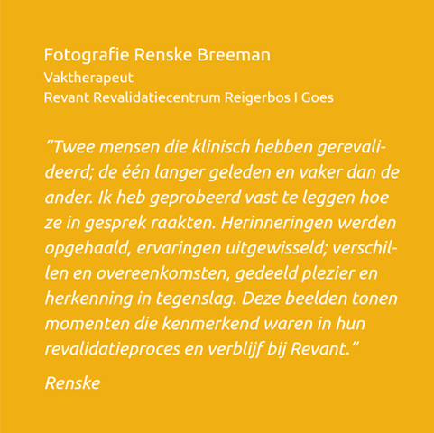 Patrick vult aan: “Als ik één ding mag zeggen tegen iemand die net begint: doe mee, werk mee, vertrouw erop dat het nut heeft. En zoek mensen op bij wie je je goed voelt. Dat helpt zó.” Ze kijken elkaar aan en glimlachen. Ze zijn verbonden aan hetzelfde centrum, leveren dezelfde strijd en hebben dezelfde overtuiging dat herstel meer is dan lichamelijke vooruitgang. Het is ook leren leven met wat er is. En dat leer je, zeggen ze allebei, bij Revant.