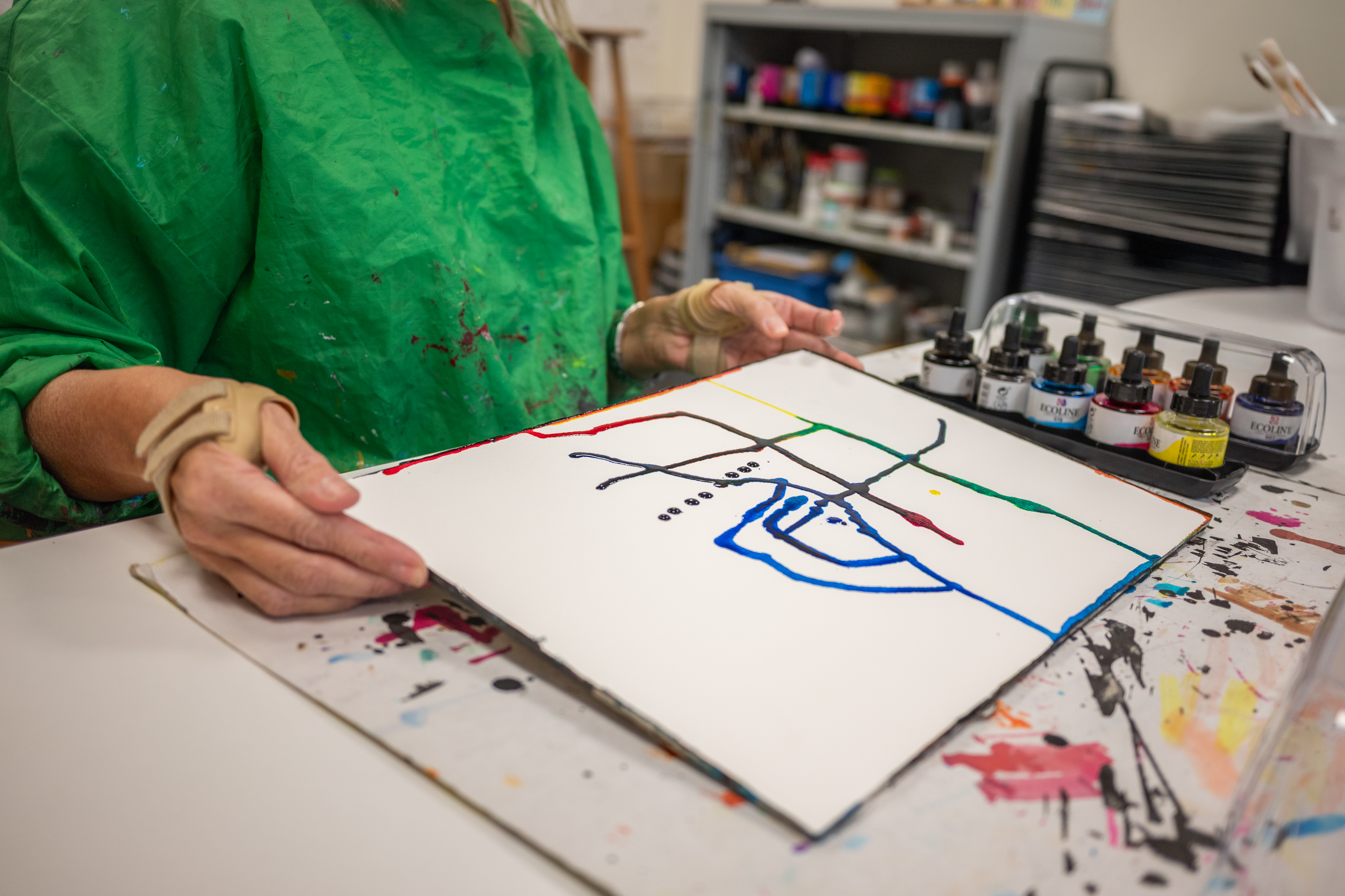 “Tijdens de therapie ontdekte ik dat ik graag met ecoline werk, omdat het me leert loslaten. Als controlfreak wil je voorkomen dat de inktlijnen door elkaar lopen, maar je hebt hier maar beperkte invloed op. Dit hielp me accepteren dat niet alles gaat zoals ik wil. Het gaf me ook ontspanning, omdat de inkt vanzelf verspreidt en ik mijn handen niet zwaar hoef te belasten.”