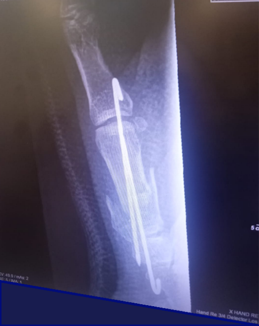 Röntgenfoto na operatie met stabilisatie van het basis duimbot Gipsspalk na operatie
