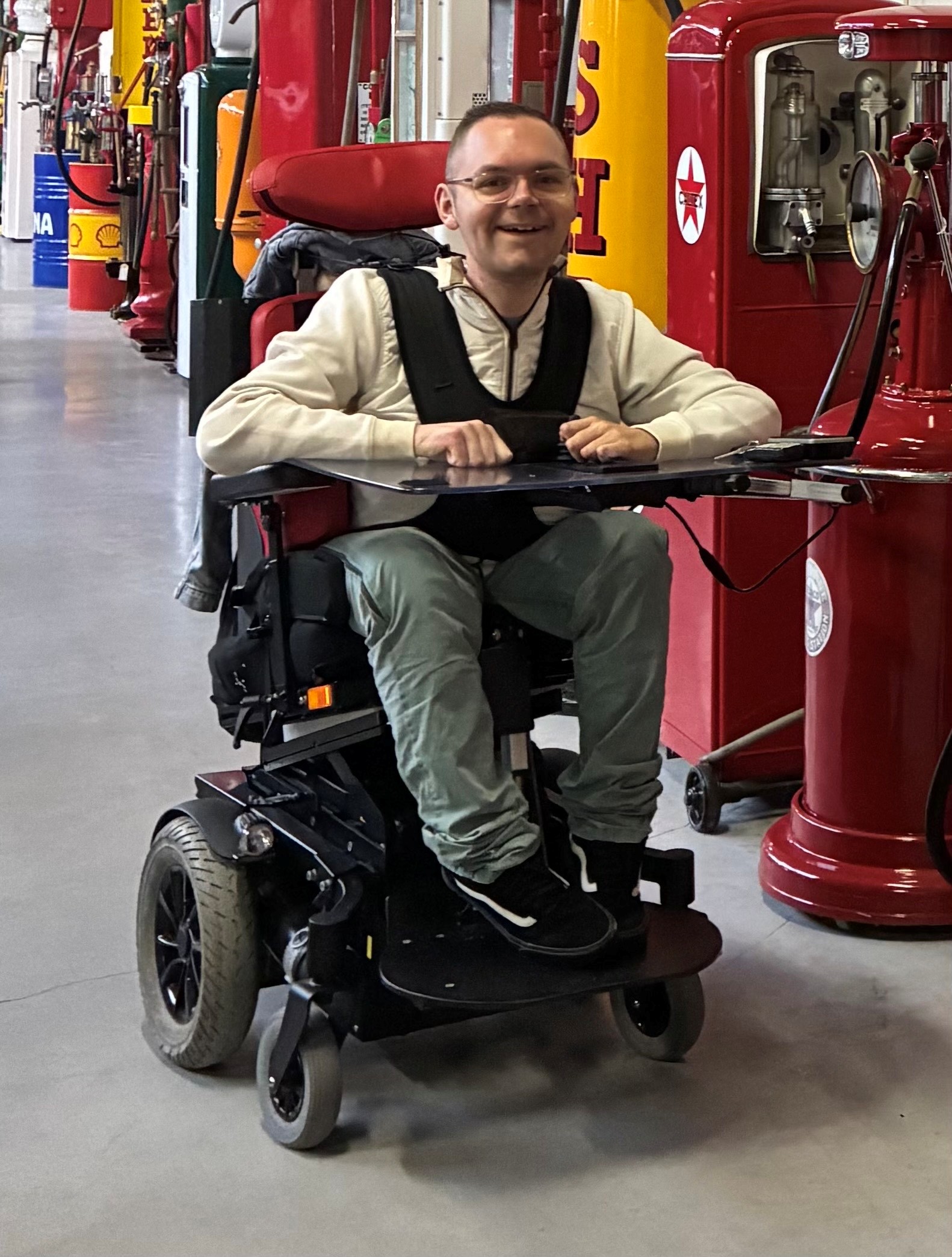 Joël kan zijn armen niet meer optillen, maar hij kan wel met zijn handen over het blad van zijn rolstoel schuiven. Zijn auto bestuurt hij met een joystick. Joël vult aan: “Ik kan ook zelfstandig eten en drinken en mijn werk doen. Ik ben heel blij met mijn baan bij een internationaal bedrijf dat printers maakt.”