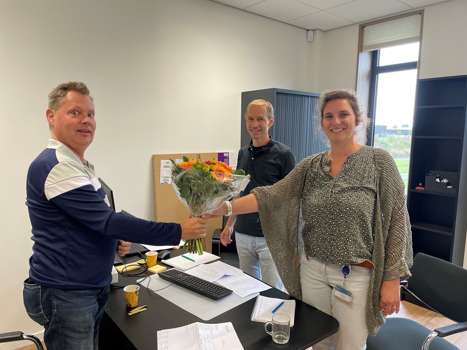 Arthur Voorn neemt een bos bloemen in ontvangst na de eerste intake van Revant Revalidatiecentrum Middelburg.